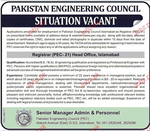 Registrar Job in Pakistan Engineering Council