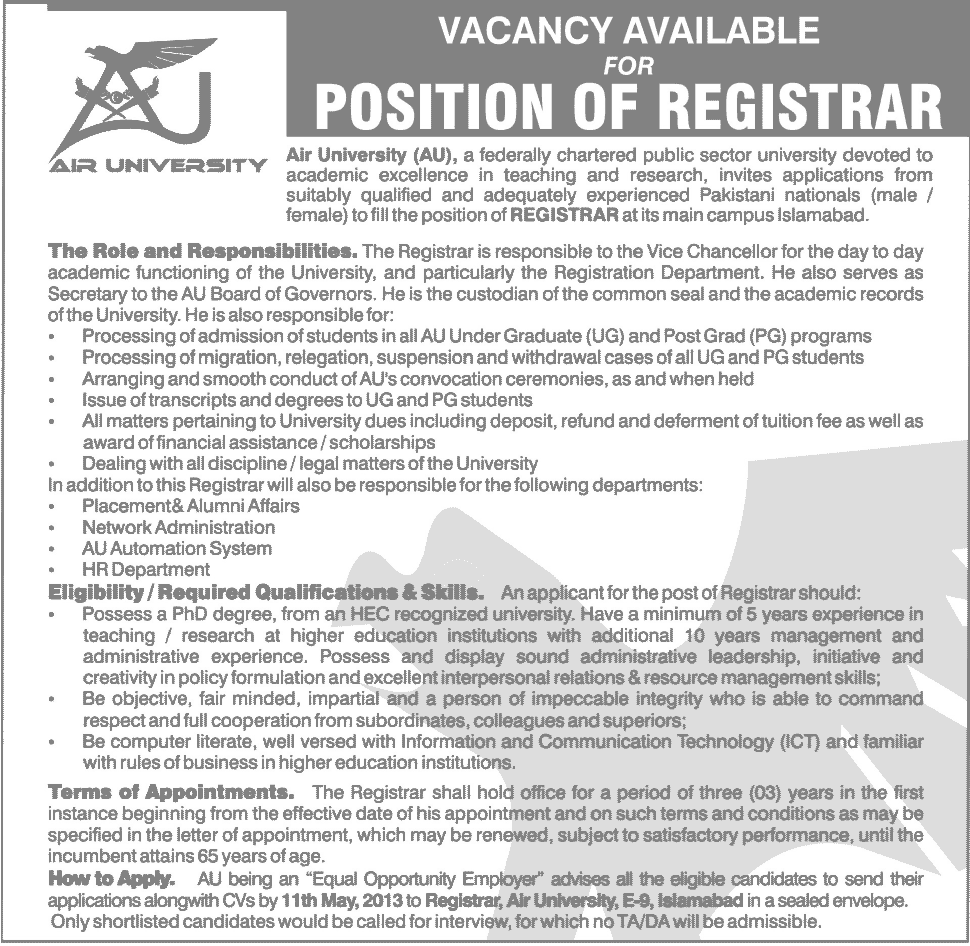 Latest Air University Admin Clerical Posts Islamabad 2025