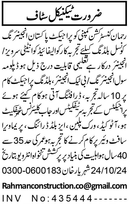 Rehman Group of Companies jobs advertisement dated about 18 October 2024 in daily Aaj Newspaper invites application for the vacant post of engineer, civil engineer, draftsman and quantity surveyor in Peshawar, peshawar Khyber Pakhtunkhwa KPK Pakistan. DAE, Bachelor, B.E and Intermediate etc. educational qualification will be preferred.