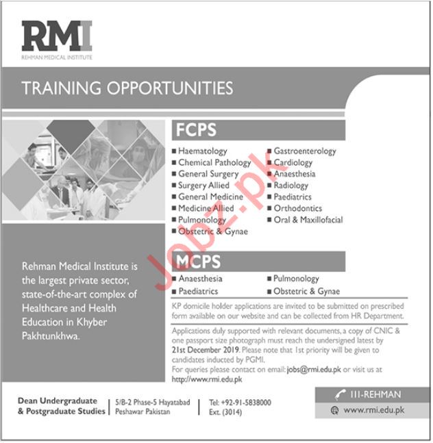 Rehman Medical Institute has announced FCPS and MCPS Training in These department Haematology , Gastronterology, Chemical Pathology, Cardiology, General Surgery, Anaesthesia, Surgery Allied, General Medicine, Radiology, Paediatrics, Medicine Allied, Orthodontics, Pulmonology, Oral Maxilofacial, Obstric, Gynaecology, Anaesthesia in Peshawar.