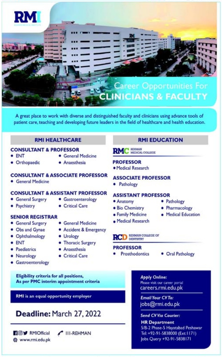Vacancies in Rehman Medical Institute RMI Advertisement March 2022