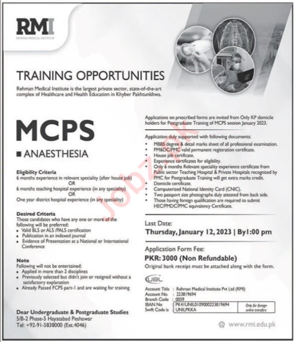Vacant posts including mcps anaethesia are announced in Rehman Medical Institute RMI Peshawar, peshawar Khyber Pakhtunkhwa KPK Pakistan as per 8 January 2023 advertisement in daily The News Newspaper. Persons with MBBS etc. education can apply.