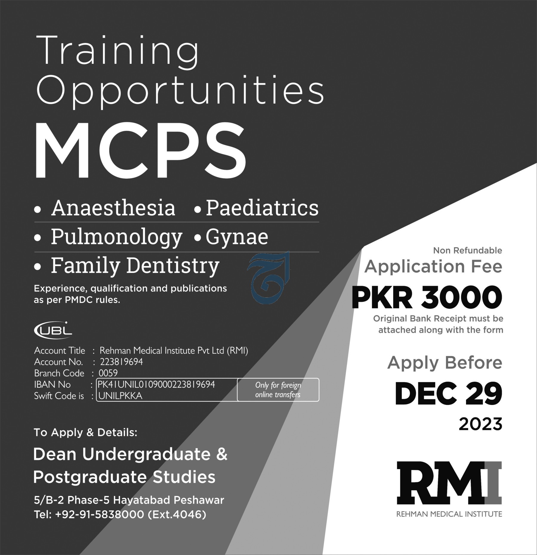 Vacant posts including mcps training program are announced in Rehman Medical Institute RMI Peshawar, peshawar Khyber Pakhtunkhwa KPK Pakistan as per 22 December 2023 advertisement in daily Aaj Newspaper. Educational qualifications required MBBS etc.
