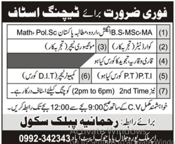 Rehmania Public School & College is looking for candidates for following posts as per job advertisement published in daily Aaj Newspaper of April 4, 2023 for location Abbottabad, abbottabad Khyber Pakhtunkhwa KPK Pakistan: