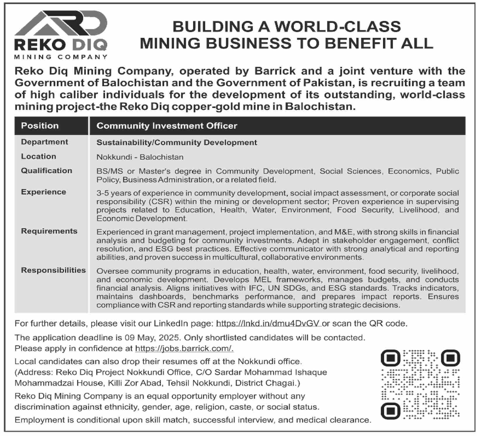 Reko Diq Mining Company RDMC Quetta, quetta Balochistan Pakistan invites applications from eligible candidates for the post of community investment officer as per advertisement of May 2, 2025 published in daily Dawn Newspaper. Persons with Master, MS and Bachelor etc. education can apply.
