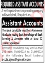 Private Company jobs advertisement dated about 18 September 2022 in daily Jang Newspaper invites application for the vacant post of assistant account in Rawalpindi, rawalpindi Punjab Pakistan. Preferred Education is MS, Master and Bachelor etc.