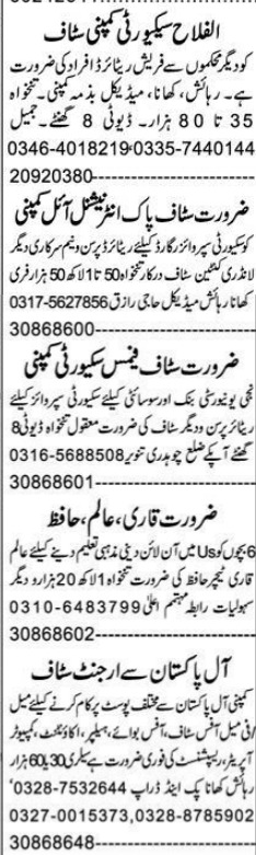 Private Company Multan, multan Punjab Pakistan invites applications from eligible candidates for the post of security supervisor, hafiz, qari, alim, receptionist, computer operator, helper, retried staff, accountant, office staff and office boy as per advertisement of December 28, 2023 published in daily Express Newspaper. Educational qualifications required Bachelor, Matric, Middle, Intermediate and Master etc.