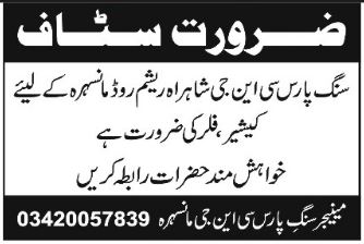 Vacant posts including cashier are announced in Sang e Paras CNG Station Mansehra, mansehra Khyber Pakhtunkhwa KPK Pakistan as per 14 September 2022 advertisement in daily Shamal Newspaper. Educational qualifications required Intermediate and Bachelor etc.