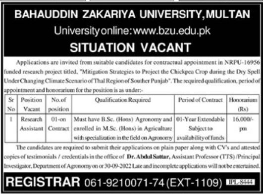 Research Assistant Jobs in Bahauddin Zakariya University BZU