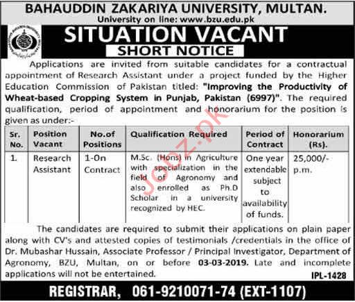 Research Assistant Jobs In Bahauddin Zakriya University