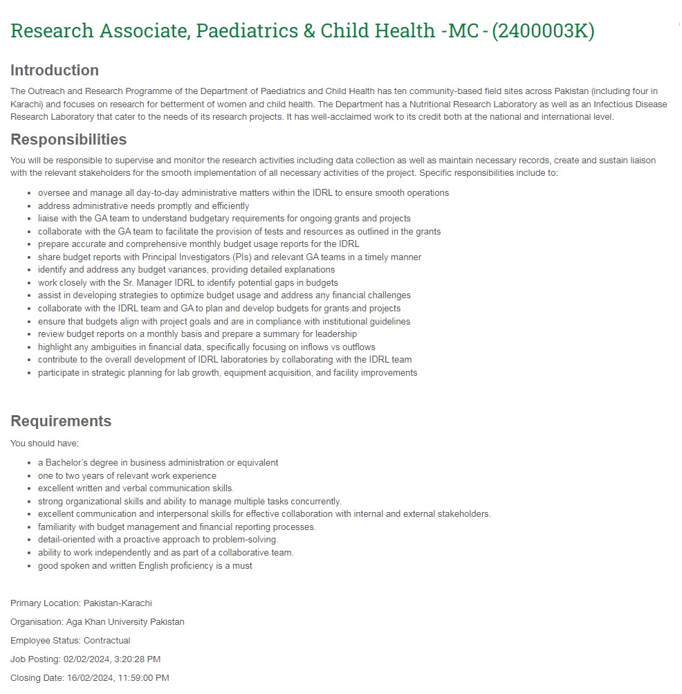 Aga Khan University invites applications for job positions advertised in daily Other dated 3 February 2024 for following vacancies in Karachi, karachi Sindh Pakistan.