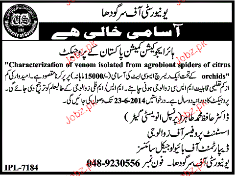 Research Associates Job In University Of Sargodha