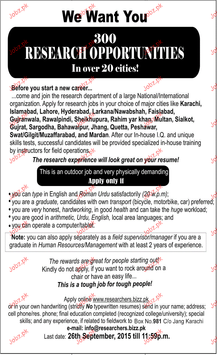 Apply as per details in job advertisement. Login to view further details of how to apply via https://www.jobz.pk online.