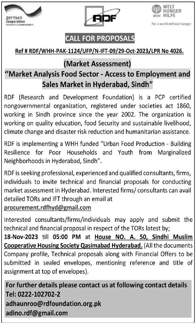 Research & Development Foundation RDF invites applications for job positions advertised in daily Express Tribune dated 29 October 2023 for following vacancies in Hyderabad, hyderabad Sindh Pakistan.