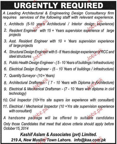 Resident Engineers, Assistant Resident Engineers, Electrical Design Engineers, Quantity Surveyors and Architectural Draftsman are required in Lahore.