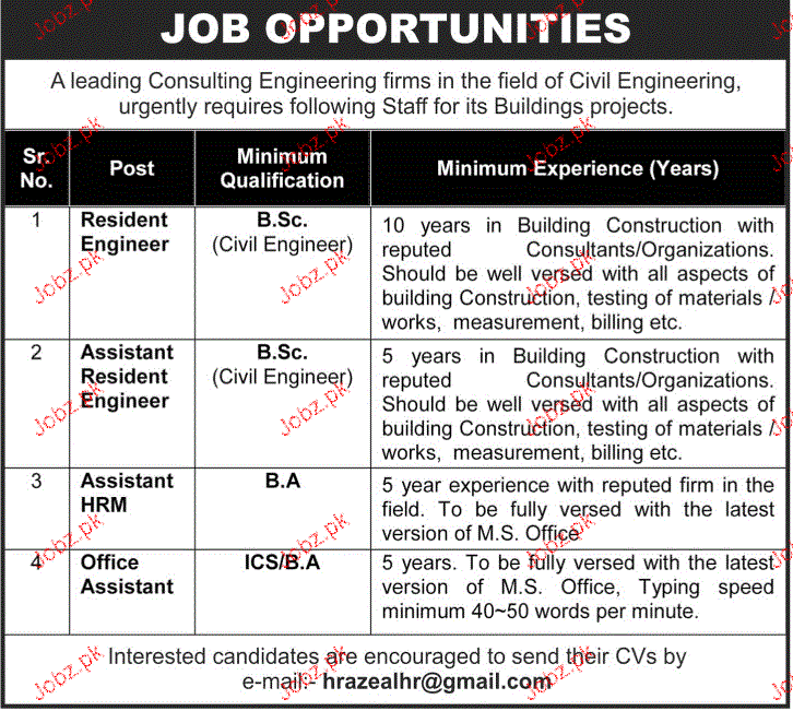 Resident Engineers, Assistant Resident Engineers , Assistant HRM and Office Assistants are required in Lahore.