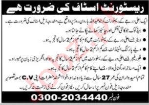 Restaurant jobs advertisement dated about 27 April 2025 in daily Jang Newspaper invites application for the vacant post of massager, floor manager, parking intendant, waitor and head cook in Abdullah Haroon Road Karachi, karachi Sindh Pakistan. Candidates with Matric, Middle, Bachelor and Intermediate etc. educational background will be preferred.