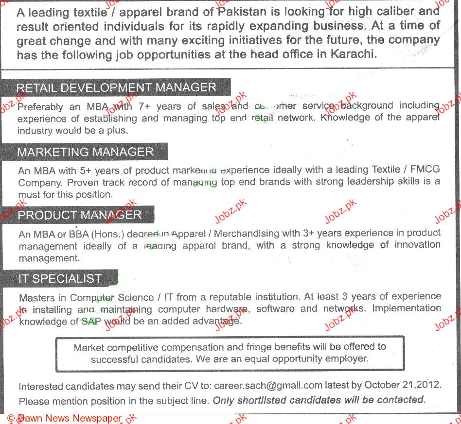 Apply as per details in job advertisement. Login to view further details of how to apply via https://www.jobz.pk online.