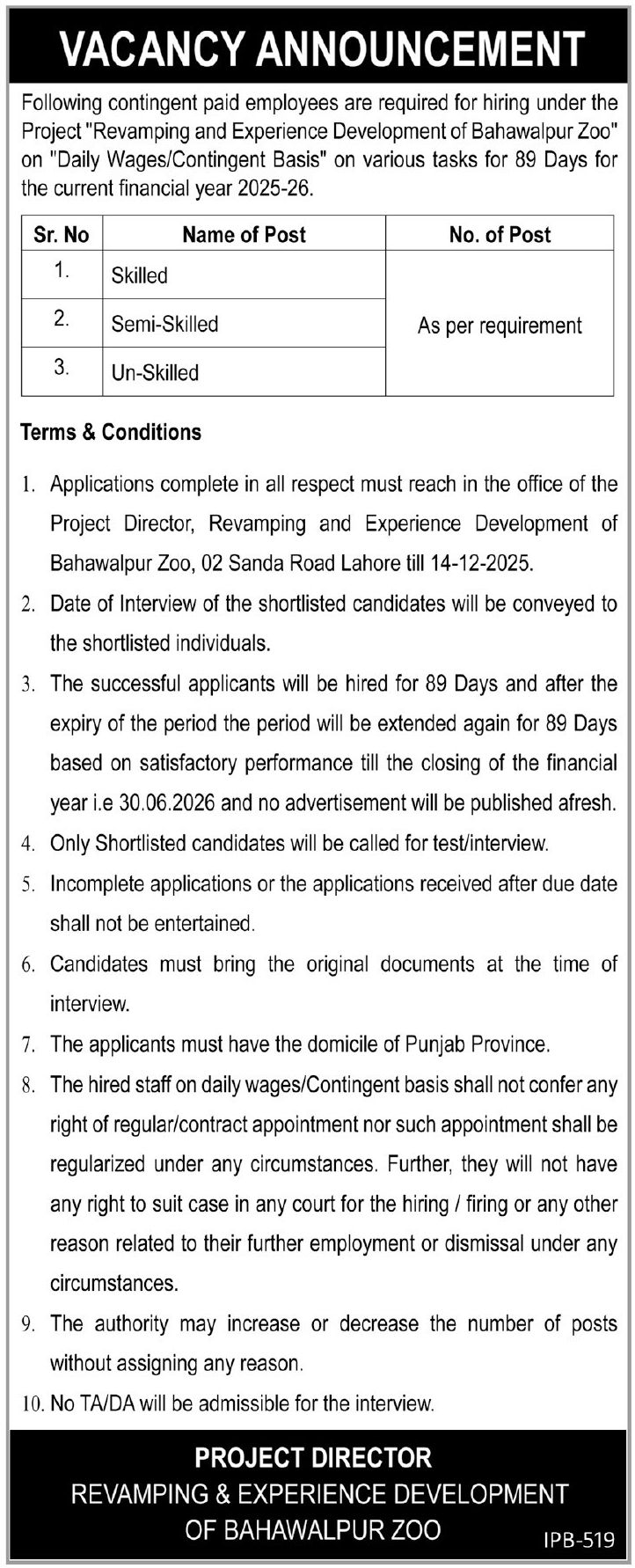 Government Organization jobs advertisement dated about 2 December 2025 in daily Express Tribune Newspaper invites application for the vacant post of skilled staff, un skilled staff and semi skilled staff in Bahawalpur, bahawalpur Punjab Pakistan. Preferred Education is Primary, Middle and Matric etc.