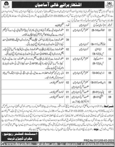 Revenue Department jobs advertisement dated about 6 March 2025 in daily Jang Newspaper invites application for the vacant post of bashti, chowkidar, accountant, clerk, ltv driver, data entry operator, htv driver, driver, assistant computer operator and naib qasid in Makran, makran Balochistan Pakistan. Preferred Education is Bachelor, DAE, Intermediate, BBA, Primary, Middle and B.com etc.