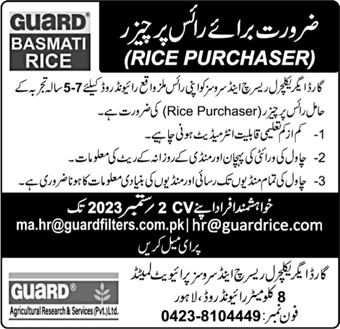 Guard Agricultural Research & Services Pvt Limited jobs advertisement dated about 25 August 2023 in daily Roznama 92 News Newspaper invites application for the vacant post of rice purchaser in Faisalabad, faisalabad Punjab Pakistan. Educational qualifications required Intermediate etc.
