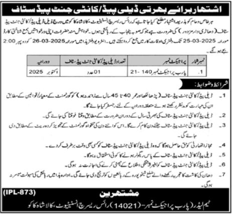 Rice Research Institute Sheikhupura, sheikhupura Punjab Pakistan invites applications from eligible candidates for the post of daily paid staff and contingent paid staff as per advertisement of March 11, 2025 published in daily Ausaf Newspaper. Educational qualifications required Middle, Matric and Primary etc.
