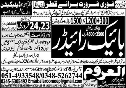 Al Aroom Enterpirses invites applications for job positions advertised in daily Express dated 22 February 2022 for following vacancies in Qatar, qatar Qatar.