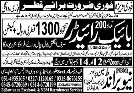 New Brand Manpower jobs advertisement dated about 12 December 2023 in daily Express Newspaper invites application for the vacant post of bike rider and rider in Qatar, qatar Qatar. Educational qualifications required Matric and Intermediate etc.
