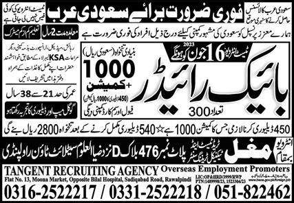 Mughal Trade Test & Technical Training Center jobs advertisement dated about 14 June 2023 in daily Express Newspaper invites application for the vacant post of rider and bike rider in Riyadh, jeddah Saudi Arabia. Candidates with Intermediate and Matric etc. educational background will be preferred.
