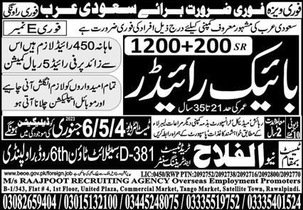 Rajpoot Recruitment Agency is looking for candidates for following posts as per job advertisement published in daily Express Newspaper of December 22, 2023 for location Jeddah, riyadh Saudi Arabia: