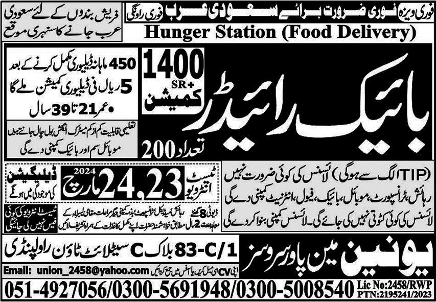 Apply at Union Manpower Services latest Overseas jobs in Driving and departments before closing date which is around March 24, 2024 or as per closing date in newspaper ad. Read complete ad online to know how to apply on latest Union Manpower Services job opportunities. Motorcycle Courier, Courier and Delivery skills may beneficial for these Union Manpower Services jobs. Salary varies from 107000. Overtime might be allowed. Facilities like transport, accommodation and medical may be provided.