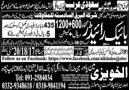 Al Khwaizy Manpower Overseas Employment Promoters latest Overseas Driving jobs and others can be applied till May 17, 2024 or as per closing date in newspaper ad. Read complete ad online to know how to apply on latest Al Khwaizy Manpower Overseas Employment Promoters job opportunities. Learn today skills like Courier and Delivery to apply confidently on these Al Khwaizy Manpower Overseas Employment Promoters jobs. Salary varies from 133000. Earn more by overtime. Facilities like accommodation, transport and medical may be provided.