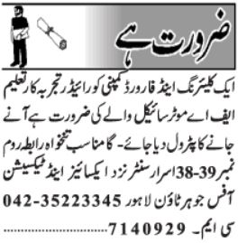Clearing & Forwarding Company is looking for candidates for following posts as per job advertisement published in daily Jang Newspaper of December 13, 2023 for location Lahore, lahore Punjab Pakistan: