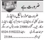 Private Company Islamabad, islamabad Islamabad Pakistan invites applications from eligible candidates for the post of rider and motorcycle rider as per advertisement of August 15, 2025 published in daily Dunya Newspaper. Candidates with Middle and Matric etc. educational background will be preferred.