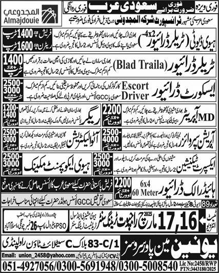 Union Manpower Services Riyadh, dammam Saudi Arabia invites applications from eligible candidates for the post of heavy equipment mechanic, htv driver, md operator, expert technician, heavy duty driver, operation supervisor, auto electrician, driver, blad traila driver, escort driver, rigger and trailer driver as per advertisement of March 12, 2025 published in daily Express Newspaper. Persons with Intermediate, Matric, Bachelor and DAE etc. education can apply.