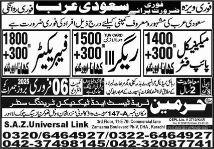 Harmain Trade Test & Technical Training Center is looking for candidates for following posts as per job advertisement published in daily Express Newspaper of February 4, 2025 for location Riyadh, taif Saudi Arabia: