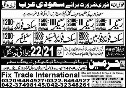 Harmain Trade Test & Technical Training Center is looking for candidates for following posts as per job advertisement published in daily Express Newspaper of July 17, 2025 for location Riyadh, tabuk Saudi Arabia: