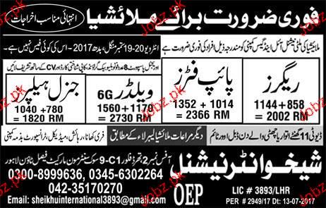 Riggers, Pipe Fitters, Welders and General Helpers are required in Malaysia. Food, Medical and Residence will be provided by the Company. Test and Interview will be held on 20 Sep.