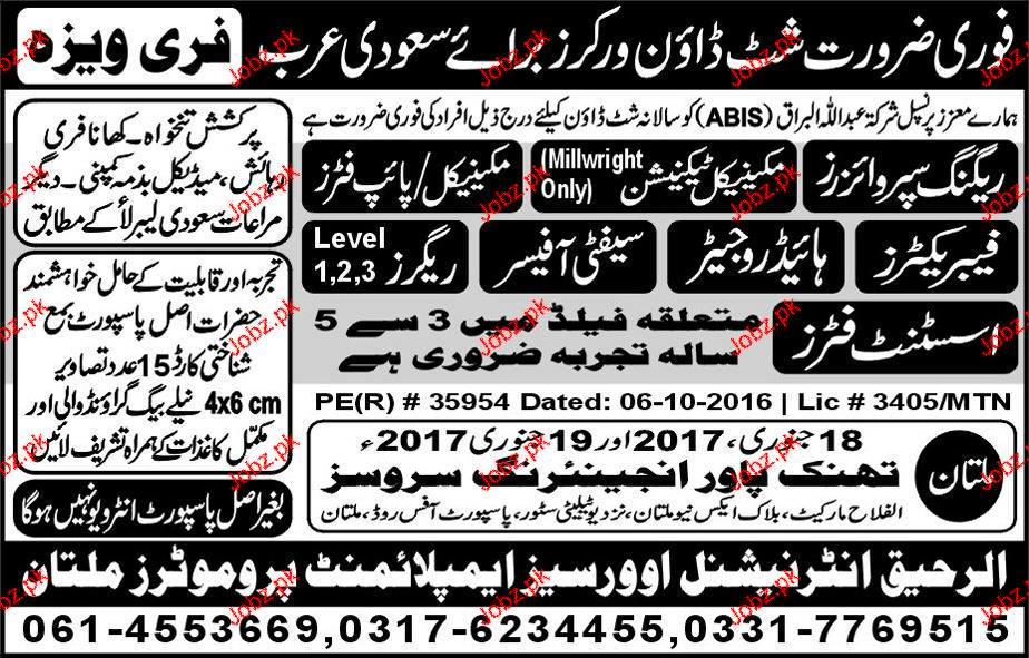 Rigging Supervisor, Mechanical Technicians, Fabricators, Safety Officers and Assistant Fitters are required in Saudi Arabia.