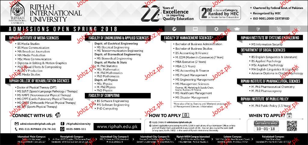 Ripha International University Admission in BS in Media, MA Broadcasting, BS Mass Communication, MSc Mass Communication, MA Media Production, MS and Mphill in Islamabad. Read newspaper ad for exact details.