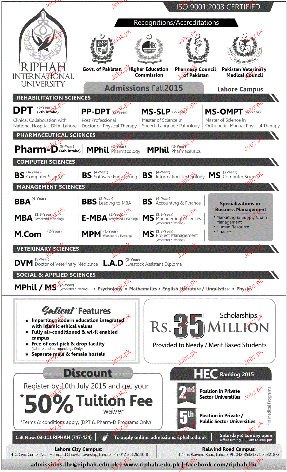 Ripha International University Admission in DPT, BBA, BBS, BBS, BS, MS, MBA and Pharm-D in Lahore. Read newspaper ad for exact details.