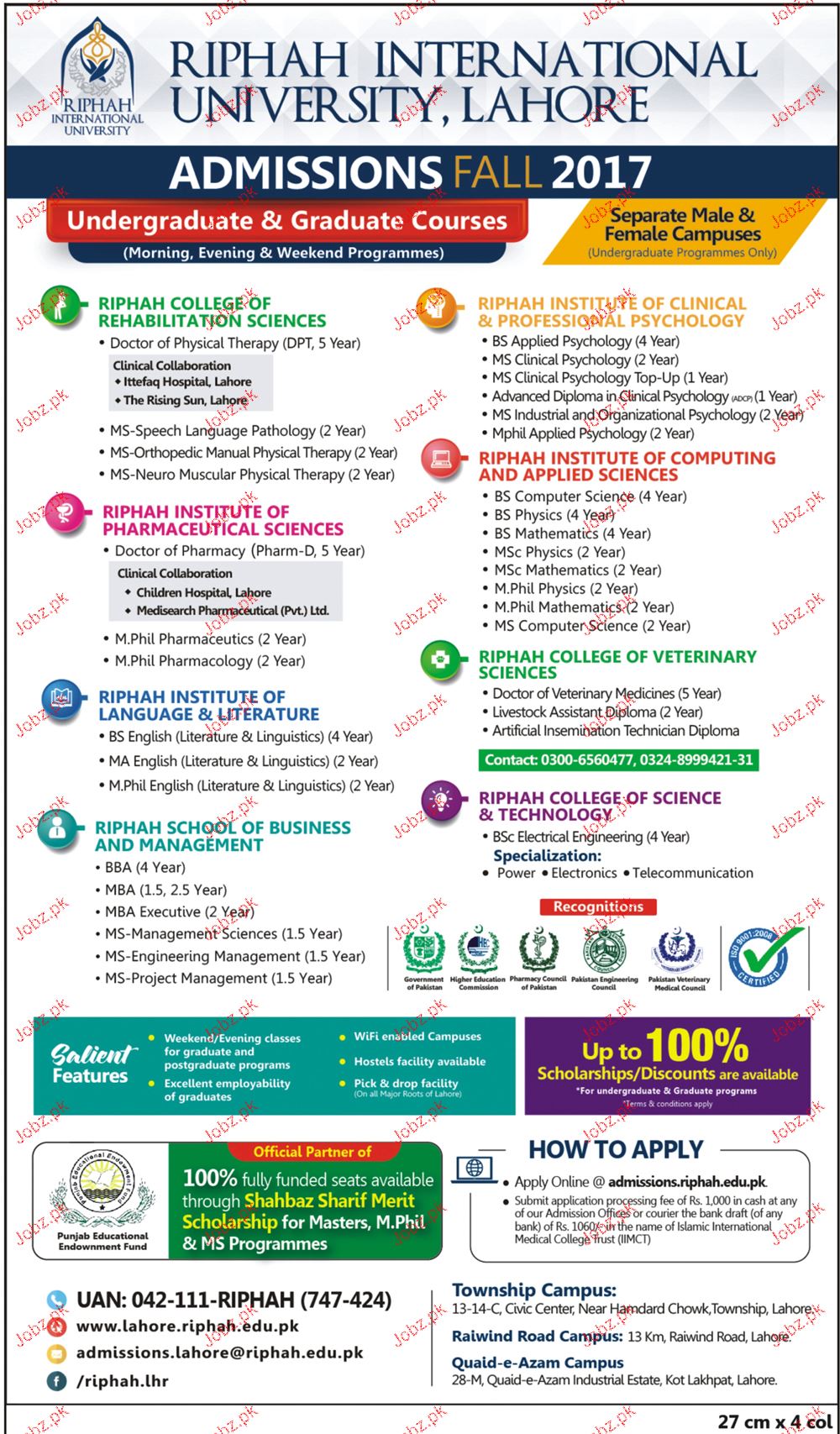 Ripha International University Admission in DPT, BS and MS in Lahore. Read newspaper ad for exact details.