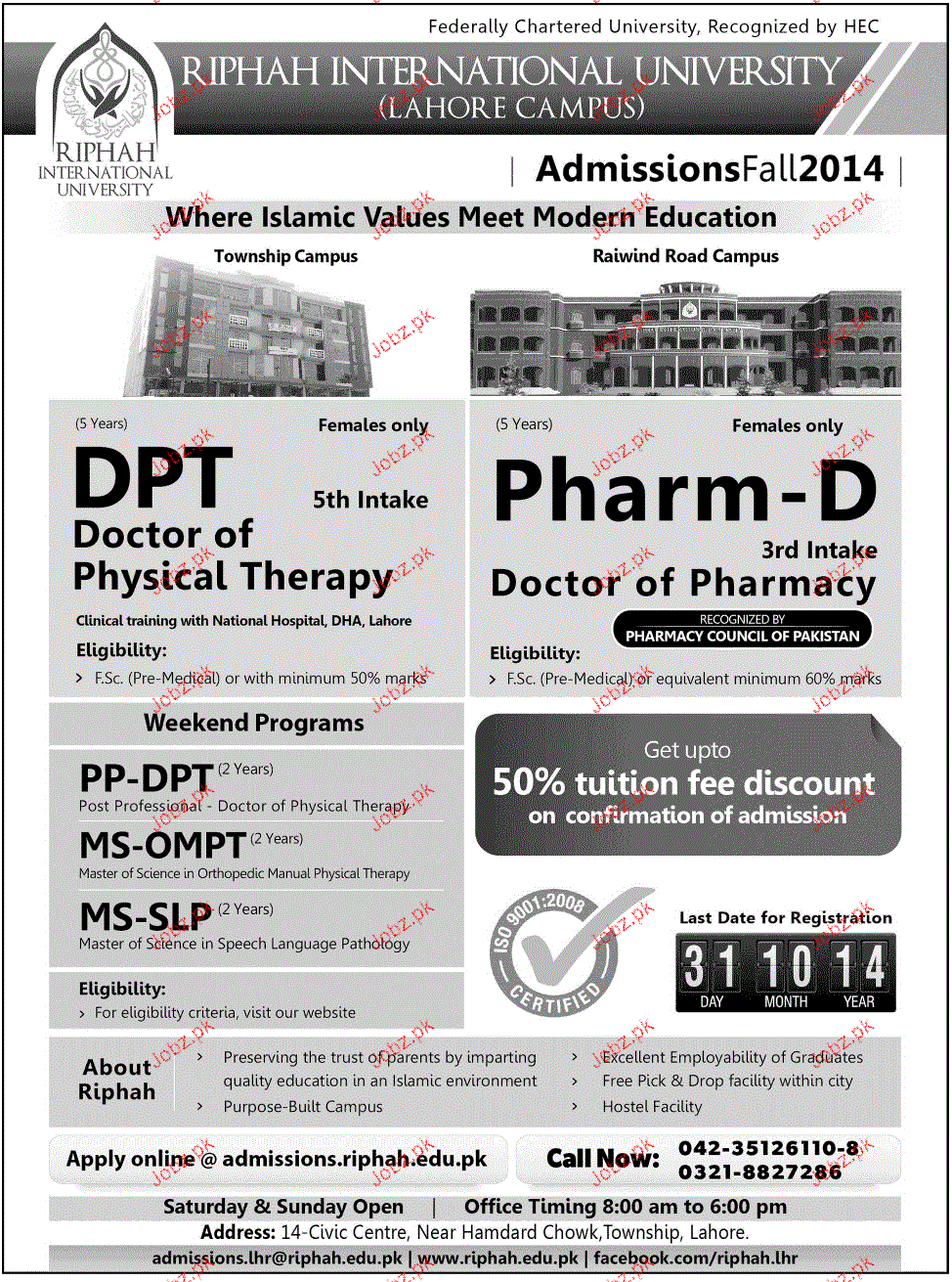 Ripha International University Admission in DPT, MS, Pharm-D and MS-OMP in Lahore. Read newspaper ad for exact details.