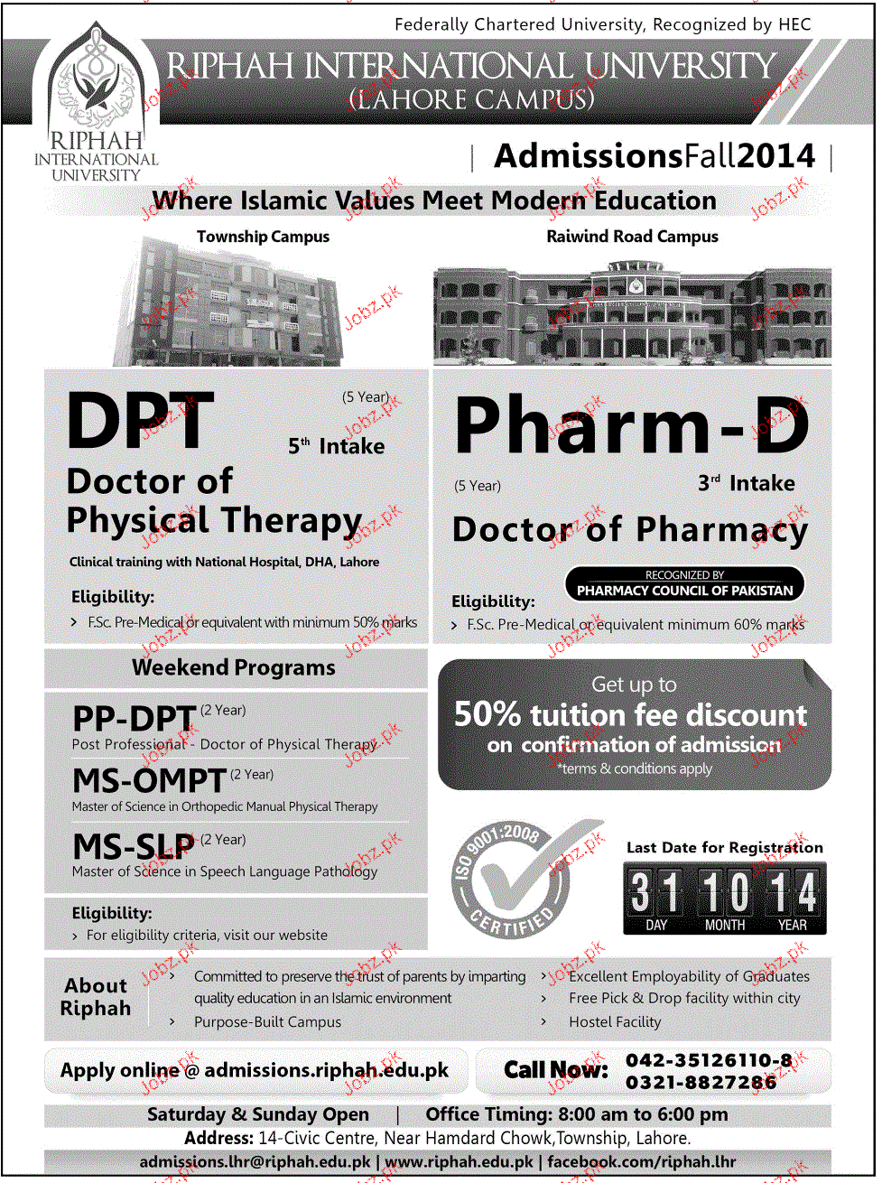 Ripha International University Admission in DPT, MS, Pharm-D and MS-OMP in Lahore. Read newspaper ad for exact details.