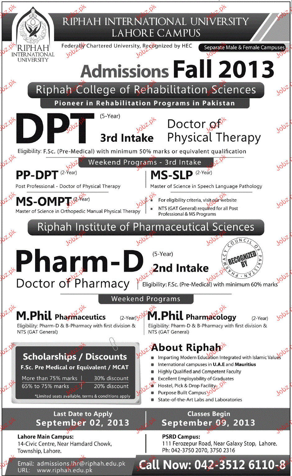Ripha International University Admission in Pharm-d, DPT and Mphill in Lahore Read newspaper ad for exact details.