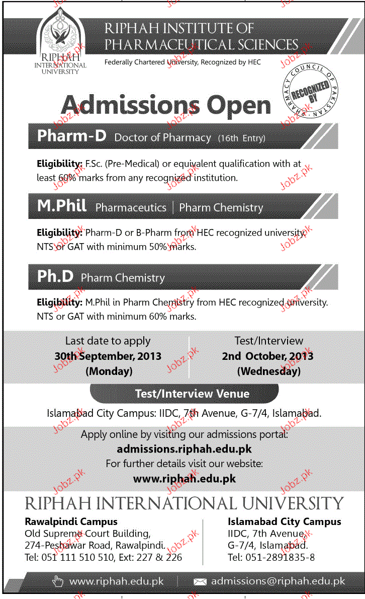 Ripha International University Admission in Pharm-d, Mphill and Phd in Rawalpindi Read newspaper ad for exact details.