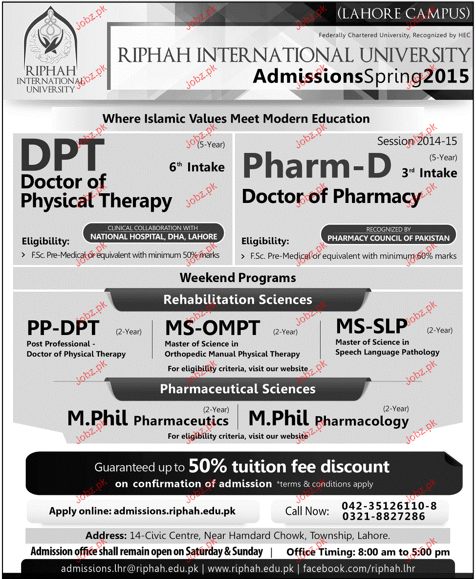 Ripha International University Admission in Pharm-D, DPT and Mphill in Lahore. Read newspaper ad for exact details.