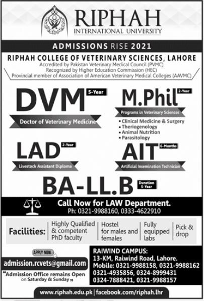 Riphah International University, Riphah College of Veterinary Sciences is seeking applications for admissions in DVM, M.Phil, LAD, AIT and BA LLB degree programs 2021. Read newspaper ad for exact details.