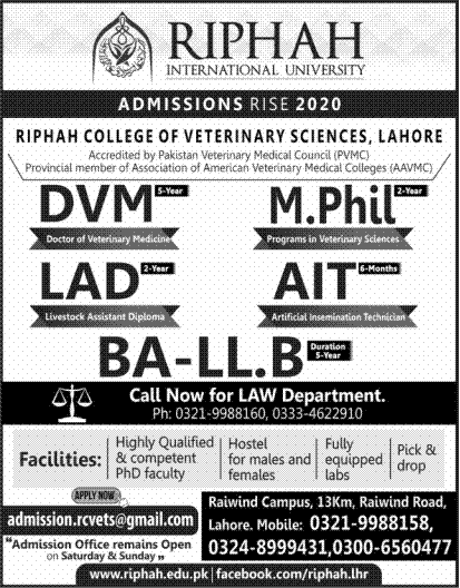 Riphah International University, Riphah College of Veterinary Sciences Lahore accredited by Pakistan Veterinary Medical Council PVMC is offering admissions in DVM, M.Phil, LAD, AIT, BA LLB degree programs. Read newspaper ad for exact details.