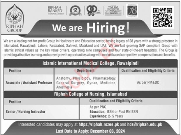 Riphah Group invites applications for job positions advertised in daily Jang dated 24 November 2024 for following vacancies in Islamabad, rawalpindi and islamabad Islamabad Pakistan.